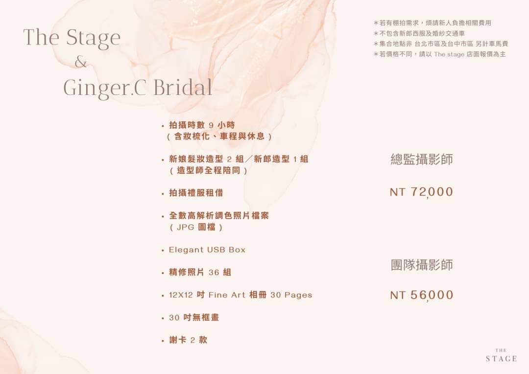 Ginger.C Bridal與 The Stage / 美式婚禮婚紗攝影團隊 聯名合作,一同滿足每位女孩變成女人的夢想,為您提供自主婚紗/自助婚紗攝影包套服務 此方案主要包含 婚紗攝影、整體造型、新娘禮服。